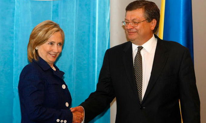 «Ми засукали наші рукава, пане міністре, щоб досягти нашої спільної мети — побудувати більш безпечну, багату й демократичну Україну», — наводить слова Клінтон радіо «Голос Америки».