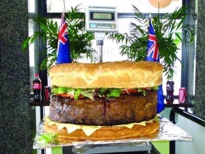 Австралійці Джо та Іман Ель-Аджуз приготували найбільший у світі гамбургер. Потім його роздали клієнтам, персоналу та постачальникам кафе. Подружжя австралійців Джо та Іман Ель-Аджуз приготували в кафе ”Амброзія” у Сіднеї гамбургер завважки 96 кг.