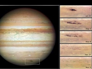 Невідоме небесне тіло завдало удару по Юпітеру: яскравий спалах на диску найбільшої планети Сонячної системи, незалежно один від одного, зафіксували в п'ятницю двоє астрономів-любителів. "Приблизно о 20.31 за Грінвічем, 3 червня (23.31 к.ч.) велика вогненна куля з'явилася на Юпітері", - повідомляє на своєму сайті австралійський астроном Ентоні Уеслі. Він і його колега з Філіппін, Крістофер Гоу, змогли зробити знімки яскравої плями і навіть зняти короткі відеоролики. "Я все ще не можу повірити, що мені вдалося в прямому ефірі зняти падіння небесного тіла на Юпітер", - каже Гоу. Поки що неясно, яке небесне тіло викликало появу спалаху на Юпітері, був це астероїд чи комета. Автори відкриття закликають своїх колег продовжити спостереження за Юпітером. Це вже другий випадок падіння на Юпітер космічних об'єктів трохи більше ніж за рік - 19 липня 2009 року на планету впав астероїд. Астрономи не бачили сам момент падіння, оскільки в цей час Юпітер був повернений до Землі іншим боком. Від зіткнення планети з тоді ще невідомим об'єктом на ній залишилася велика чорна пляма. Пізніше за її характеристиками астрономи визначили, що об'єкт, що стрівся планеті, був саме астероїдом, а не кометою.