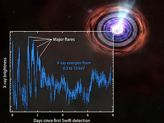 Астрономи виявили надзвичайно потужний вибух зірки, що потрапила в чорну діру. Зазвичай спалахи гамма-випромінювання, викликані такими подіями, тривають всього по дві години. Але на цей раз коливання радіоактивності тривають вже більше тижня.