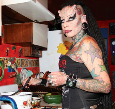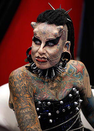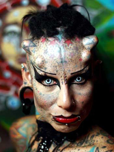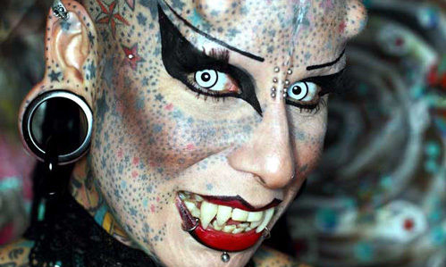 Днями в Монтерреї на виставці татуювань 36-річна мексиканка Марія Хосе Крістерна викликала справжній фурор. За допомогою наколок, що покривають все її тіло, пірсингу і титанових імплантатів у лобі жінка здійснила свою мрію перетворитися на "вампіра". Її знімки обійшли всі таблоїди світу, зробивши Марію справжньою зіркою, повідомляє eg.ru.