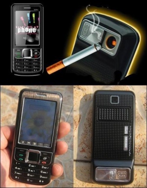 Мобілку з вбудованим прикурювачем пропонує китайська компанія Seabright Inernational Limited. Модель Lighter Phone SB6309 компанія називає не інакше як "першим в світі телефоном із запальничкою". Спіралька, що розжарюється, захована на тильній стороні мобілки за віконцем. Важко сказати, наскільки легко з SB6309 пропалити штани, а ось як позначається робота запальнички на роботі акумулятора - зрозуміло. В іншому Lighter Phone нічого особливо видатного немає: 900/1800/850/1900 GSM, Bluetooth, Mp3, FM-радіо, камера 1,3 мегапікселя. Ну хіба що апарат може працювати з двома SIM-картами. Телефон доступний в чотирьох варіантах: чорний, червоний, коричневий і сріблястий із золотим.
