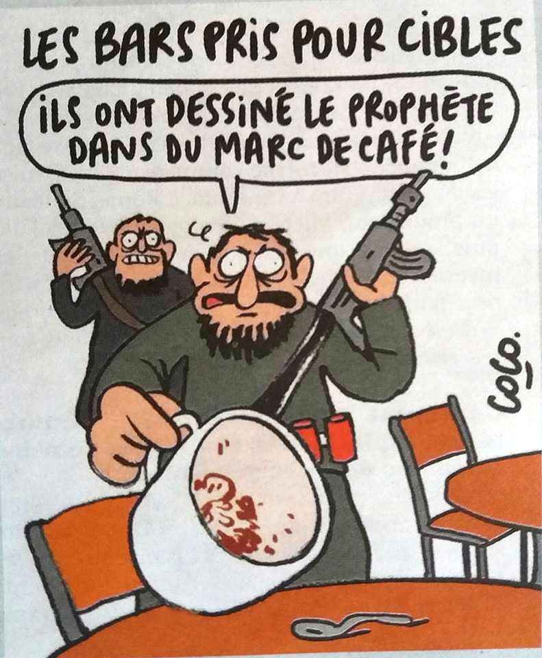 «Паризькі бари під прицілом: вони намалювали пророка в кавовій гущі всередині чашки», — написано на іншому малюнку.
