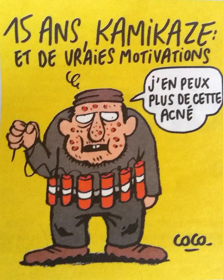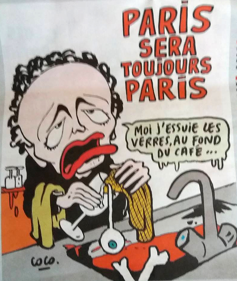 У номері кілька журналістських малюнків присвячені атакам бойовиків в п’ятницю. На обкладинці, яка раніше вже була анонсована, молода людина п’є шампанське. Видно, як воно виливається через рани на його тілі. На малюнку написано «У них є зброя. Нам плювати. У нас є шампанське».
