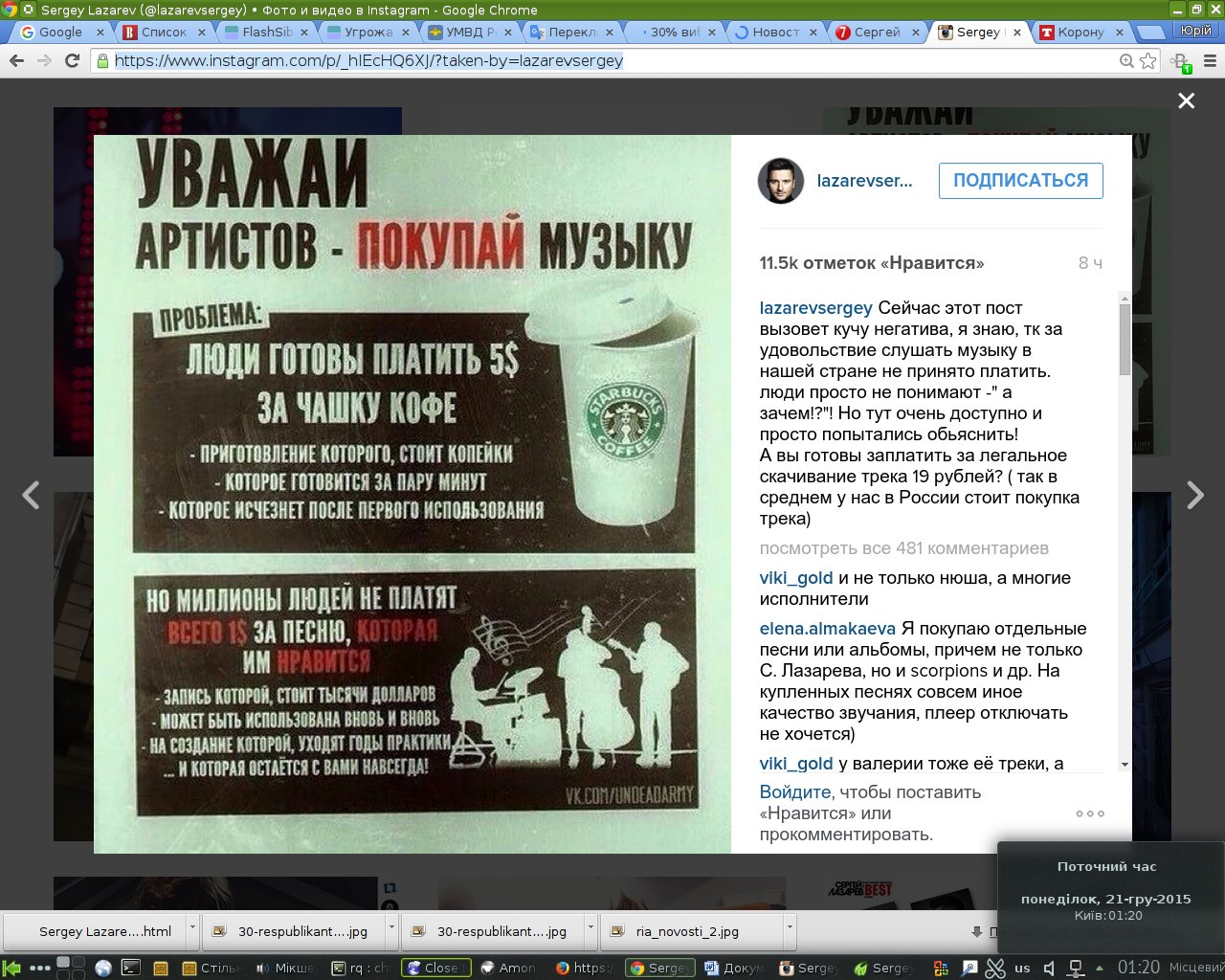Відомий російський виконавець Сергій Лазарєв на своїй сторінці у Instagram опублікував «антипіратське» звернення до громадськості, у якому порівнює ціну та витрати на виготовлення однієї чашки кави з витратами на запис у студії однієї пісні.