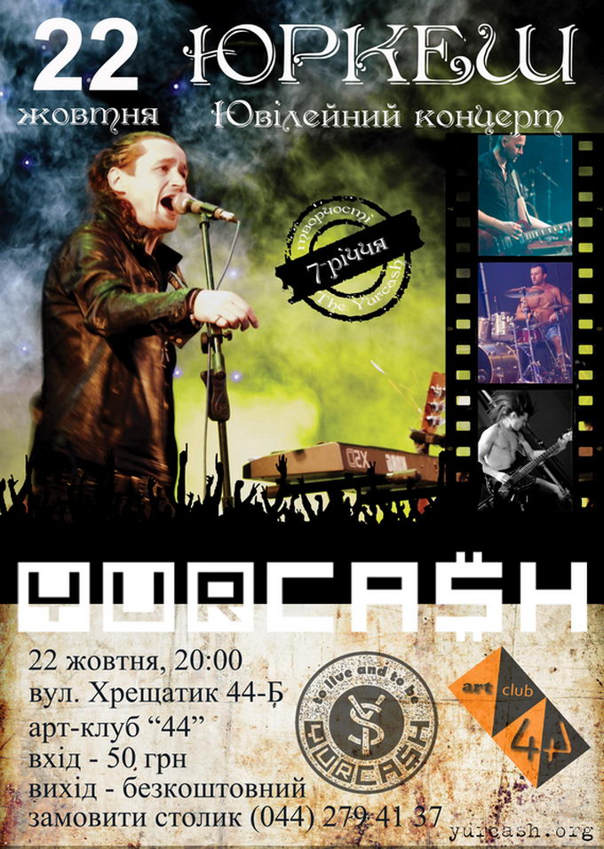 22 жовтня в легендарному арт-клубі «44» відбудеться ювілейний концерт українського рок-гурту «Юркеш» (The Yurcash), присвячений 7-річчю творчої діяльності колективу.