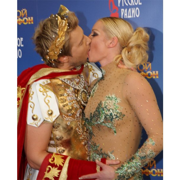 Басков і Волочкова епатували не тільки нарядами — коротка червоно-золотиста туніка на Миколі і практично прозорий комбінезон на Анастасії, — але і пристрасним поцілунком.