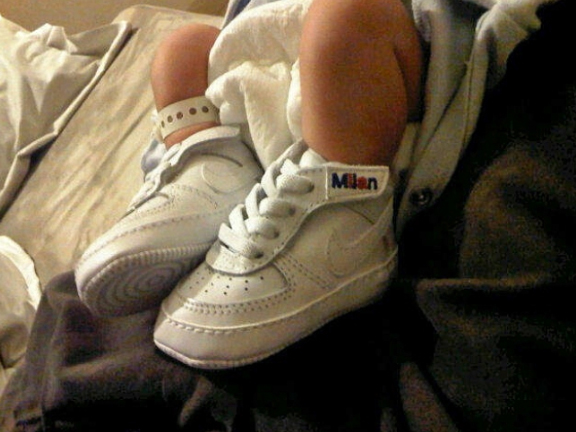 Татко-футболіст привчає малечу до спортивного взуття. На знімку зображені крихітні ніжки малюка в ексклюзивних білих кросівках Nike. На черевичках можна прочитати ім'я дитини. І хоча кросівки ще завеликі Мілану, мабуть, його батькові вже не терпиться зробити з сина великого футболіста, як і він сам.