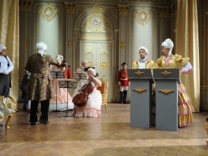Звичайно ж, випуски новин при дворі імператриці сильно відрізняються від звичних для нас програм новин. По-перше, ведучі приходять до своєї єдиної телеглядачки, а не спілкуються через телевізор. По-друге, замість офіційних ділових костюмів, як це прийнято в наш час, героїв Шепелєва й Єфросініної одягнуть у вбрання, що відповідає епосі Катерини ІІ, - напудрені перуки, мереживні панталони, розшиті камзоли й пишні плаття. По-третє, звичні музичні заставки й відбивки в «Козаках» замінили живим оркестром.