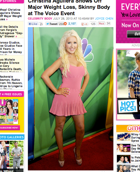 Подейкують, Крістіні вдалося схуднути на 15 кілограмів. Тож тепер залюбки демонструє стрункі сідниці та ніжки. Так, на прес-конференції Агілера з'явилася в короткій сукні рожевого кольору з глибоким декольте і бежевих черевичках на високих підборах. Довгі локони співачки були розпущені по плечах. Своїм зовнішнім виглядом співачка буквально викликала фурор.