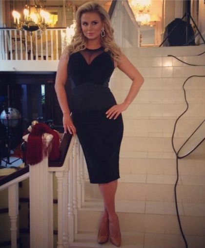 Анна позує в елегантній чорній сукні до коліна, що обтягує фігуру, пишний бюст красуні підкреслений сітчастою тканиною, а на ногах лаконічні туфлі-лодочки на високих підборах кольору «нюд». Довершили образ акуратні кучері та прикраси.