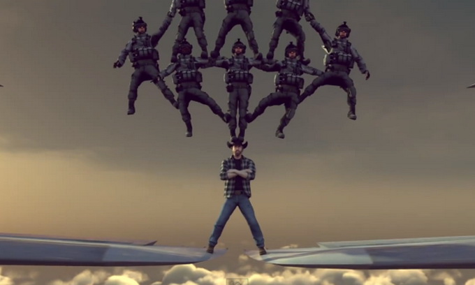 У відео Норріс у повітрі стоїть на крилах літаків, а на його легендарному ковбойському капелюсі балансують одинадцять десантників-акробатів з вогниками у руках. Ролик створила одна digital-компанія і настільки вдало, що Чак Норріс виглядає як справжній, а це викликало серед шанувальників артиста підозри.