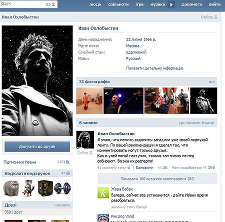 «За рекомендацією сина Василя зареєструвався у «ВКонтакте». Діти впевнені, що твіттер содоміти скоро мені перекриють. Страховка», — написав у Twitter Охлобистін.