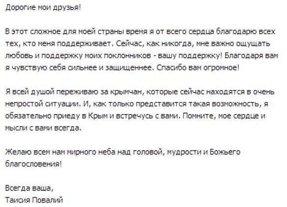 «Я всією душею переживаю за кримчан, які зараз знаходяться у дуже непростій ситуації. І як тільки випаде нагода, я обов'язково приїду в Крим та зустрінуся з вами», — пообіцяла Повалій.