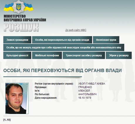 Зазначається, що Олексій Анатолієвич Гриценко розшукується Управлінням по боротьбі з організованою злочинністю ГУ МВС Києва.