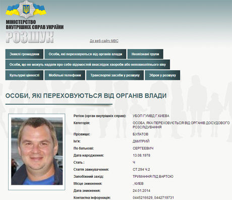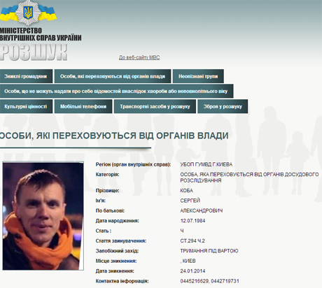 Активісти Євромайдану і Автомайдану Олексій Гриценко, Сергій Коба та Дмитро Булатов оголошені у розшук. Відповідне оголошення розміщено на сайті МВС.