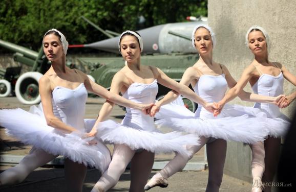 Уривок з «Лебединого озера» виконали одеські балерини біля стін Військово-історичного музею на вулиці Пироговській в Одесі.