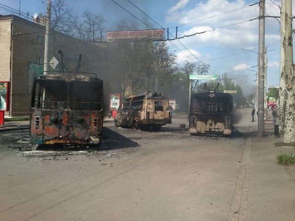 Після активних дій сепаратистів у місті скрізь стоїть обгорілий транспорт.