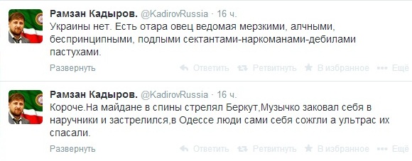 Голова Чеченської республіки Рамзан Кадиров назвав українців отарою овець. Про це він написав у своєму Твіттері.