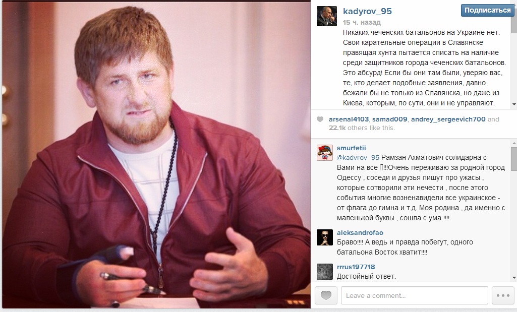 «Свої каральні операції в Слов'янську правляча хунта намагається списати на наявність серед захисників міста чеченських батальйонів. Це абсурд! Якби вони там були, запевняю вас, ті, хто робить подібні заяви, давно бігли б не тільки зі Слов'янська, але навіть з Києва, яким, по суті, вони і не керують. Прошу заспокоїтися Арсена Авакова та інших, які бачать в кожній смаглявій людині чеченця і здригається, вимовляючи це слово. Якщо людина смаглява, це не означає, що він обов'язково чеченець», – пише Кадиров.
