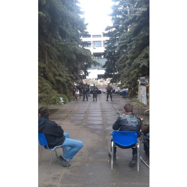 У соцмережах пишуть, що біля міськради перебувають військові, які стріляють у повітря. Навколо будівлі – близько 200 мітингувальників та сепаратистів.
