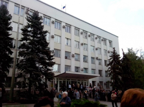 Возле здания ЦИК в Донецке дежурят «бойцы самообороны ДНР», в руках у них автоматы.