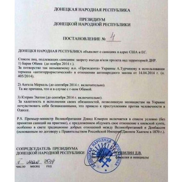 У постанові за підписом «співголови президіуму ДНР» Дениса Пушиліна, яку розмістили у Twitter Новости Донбасса», ідеться також про прем'єр-міністра Великобританії Девіда Кемерона. Його до списку включили «умовно». Кемерону пропонують переглянути своє ставлення до нинішньої центральної влади України, яку в ДНР уперто називають, слідом за російськими ЗМІ, «київською хунтою».