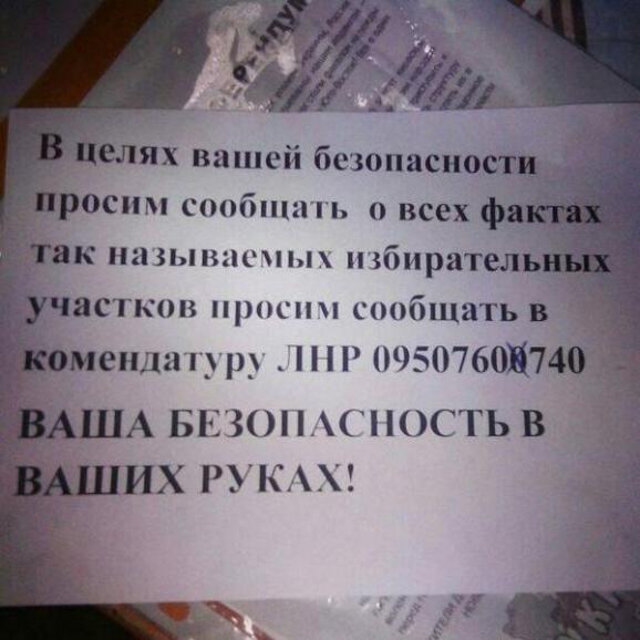 На вулицях Луганська з’явилося оголошення, в якому просять повідомляти про всі виборчі дільниці в «комендатуру Луганської республіки». Проте, це лише припущення, адже повідомлення має досить загадковий зміст, пише espreso.tv