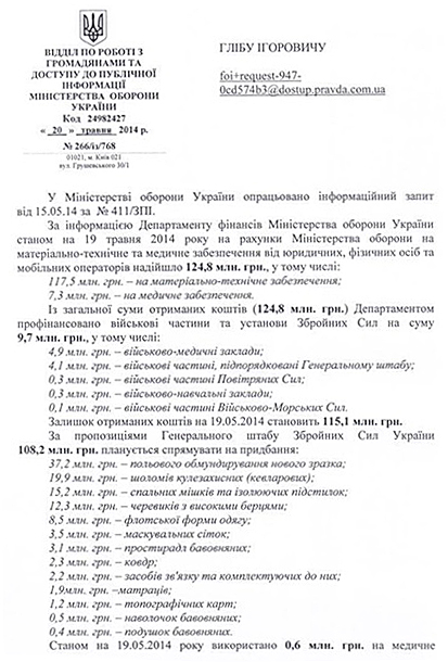 Українці зібрали для армії 124,8 млн гривень, сказано у відповіді Міністерства оборони України на інформаційний запит Української правди.