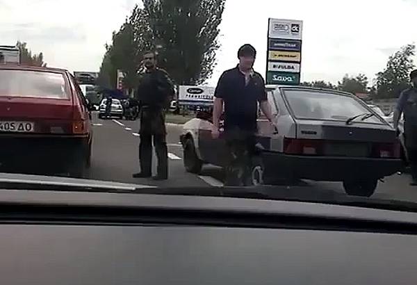 Когда машина снова двинулась в путь, водитель и пассажиры увидели террористов кавказской внешности. «Это чеченцы, батальон «Восток», — сказал автор видео. Один из чеченцев остановил машину (2:25) и спросил, не видели ли пассажиры красную «Черри». Также машина проезжает мимо грузовика, возле которого несколько дней назад расстреляли трех человек.