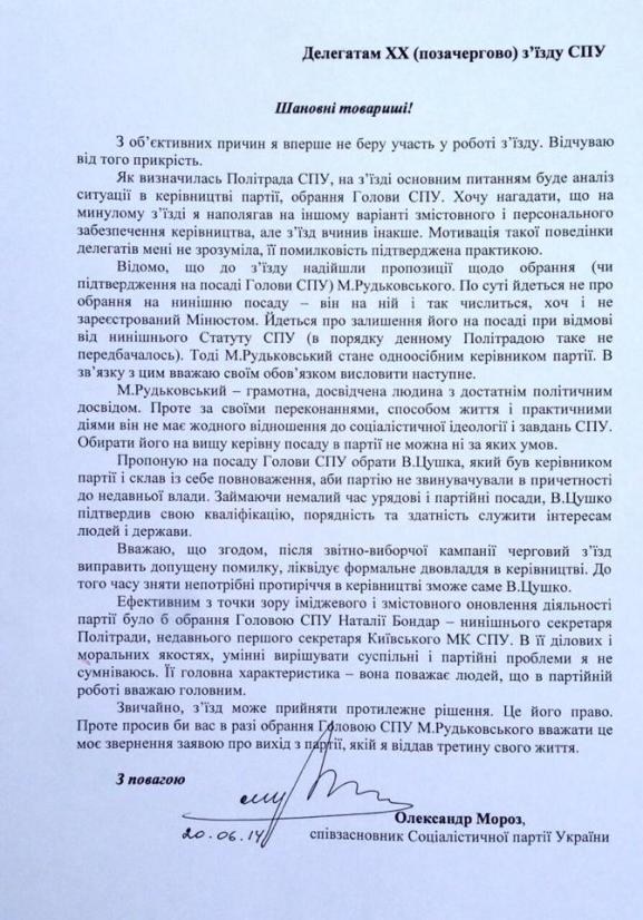 "Просив би вас у разі обрання главою СПУ М. Рудьковського вважати це моє звернення заявою про вихід з партії, якій я віддав третину свого життя", - зазначив Мороз.