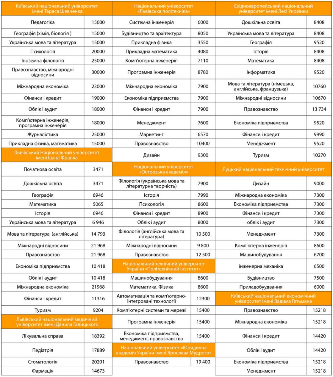 А от від столичних цін очі лізуть на лоб. Так, «Правознавство» у Київському національному університеті імені Тараса Шевченка вартує аж 30 тисяч гривень за рік. Тож, аби лише стати бакалавром, доведеться викласти цілих 120 тисяч гривень. Стільки ж потрібно, щоб стати експертом із міжнародних відносин. Найдешевше в цьому вузі вчитися на гуманітарних і природничих спеціальностях. Що «Хімія», що «Українська мова та література» обійдуться у 15 тисяч гривень. А от на іноземній філології — на цілих десять тисяч дорожче. Різноманітні економічні напрямки потягнуть теж немало — 18–19 тисяч гривень.