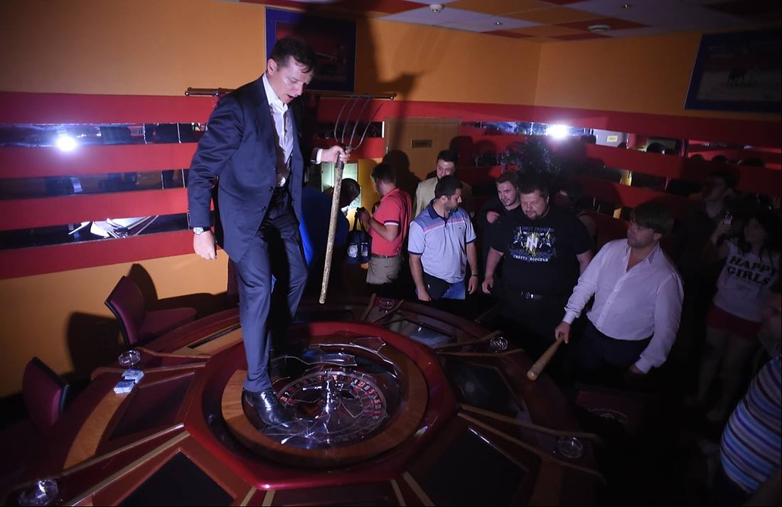 Ляшко традиційно прийшов на акцію з вилами. Ігрові автомати він трощив битою, а потім виліз на гральний стіл з рулеткою і топтався по ньому ногами.