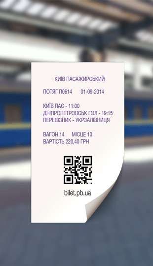З 1 вересня ПриватБанк почав продаж через сайт bilet.pb.ua, Приват24, а також мережу відділень електронних залізничних квитків з QR-кодом. Як повідомили в банку, такі квитки не потрібно обмінювати в касах на звичайні – достатньо показати провідникові роздруківку електронного проїзного документа або збережену копію квитка на смартфоні, планшеті або ноутбуці. Якщо з якоїсь причини роздруківка квитка відсутня, ідентифікатором квитка можуть виступити паспортні дані пасажира.
