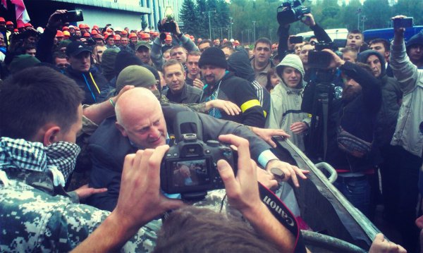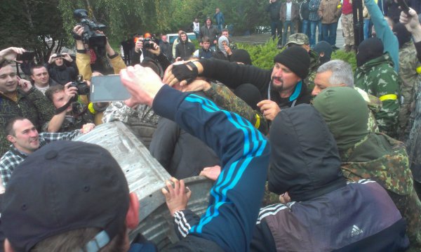 Після початку засідання облради через деякий час активісти насильно виштовхали із сесійної зали Олександра Данильчука та кинули його до смітника.