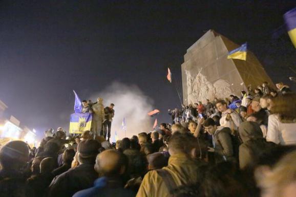 Ультрас запалили фаєри і димові шашки. Навколо поваленого Леніна зібралися кілька тисяч людей, які святкували цю подію.
