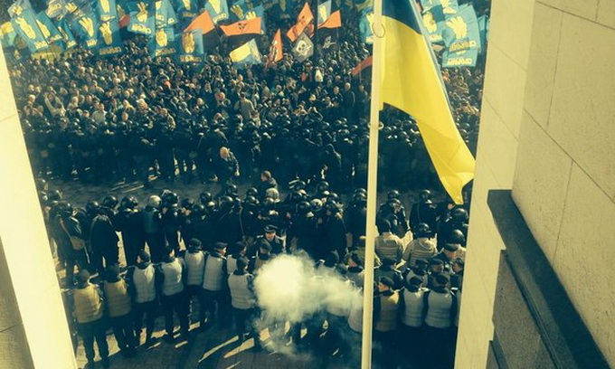 Від мітингувальників-націоналістів, які чисельністю близько 200 осіб зібралися під стінами Верховної Ради з прапорами УПА, почали летіти шумові гранати до головних дверей будівлі, передає УНН.