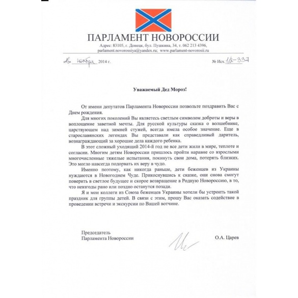 Колишній народний депутат від «Партії регіонів» Олег Царьов, один із ватажків найманців на Донбасі написав листа Дідові Морозові від імені бойовиків «Новоросії».