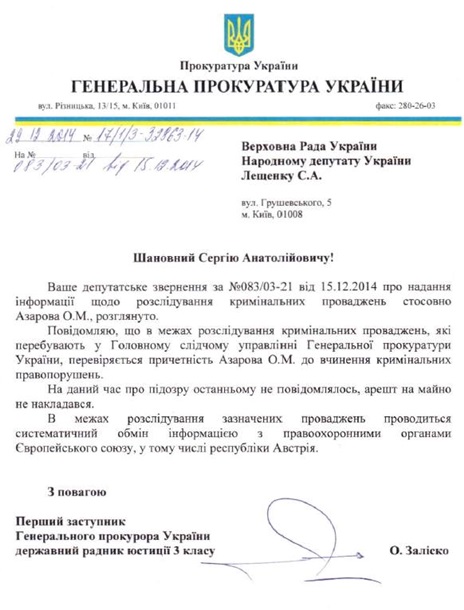 "У рамках розслідування кримінальних проваджень, які перебувають у Головному слідчому управлінні Генпрокуратури України, перевіряється причетність Азарова О. М. до скоєння кримінальних правопорушень. Наразі про підозру йому не повідомлялося, арешт на майно не накладався", - йдеться у документі.