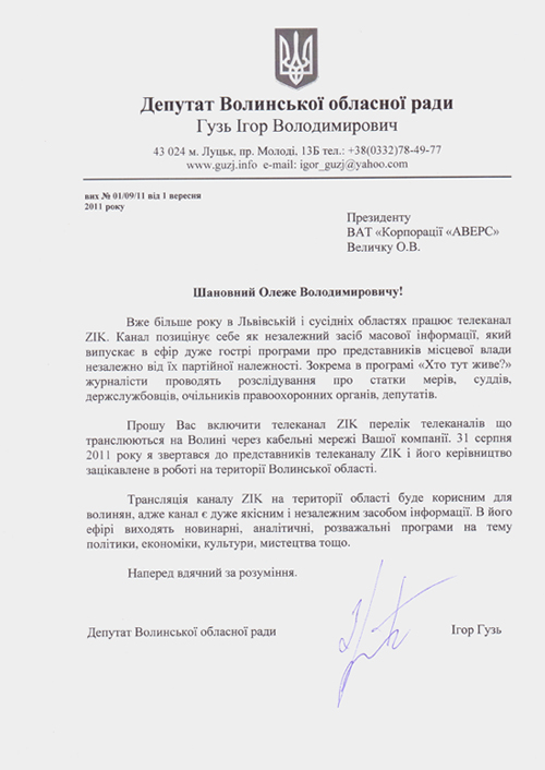 Депутат Волинської обласної ради Ігор Гузь звернувся до представників корпорації «Аверс» із пропозицією транслювати телеканал ZIK на Волині через мережі кабельного мовника.