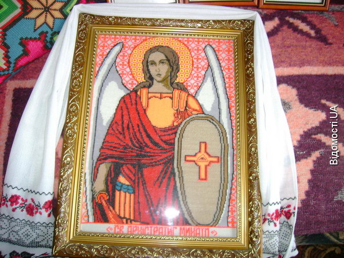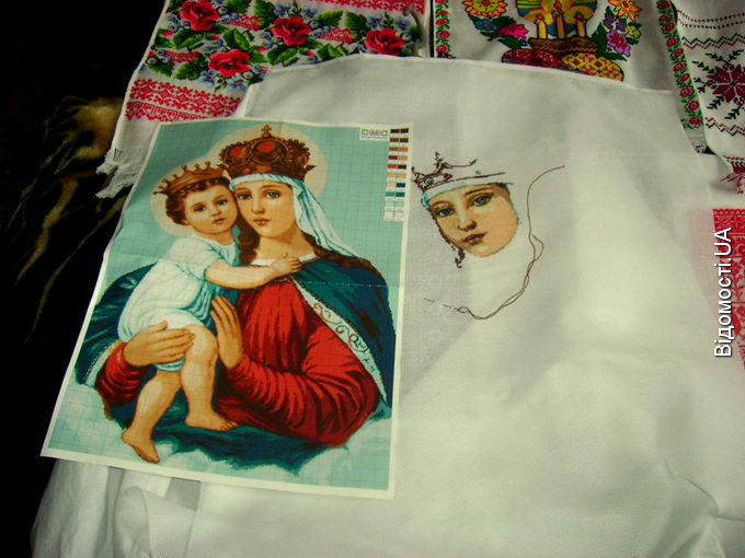 — Ось цю ікону Божої матері з Ісусом, — жінка показує образ на стіні у рамці, — я вишивала два дні, потім вона пролежала два роки, поки до неї знову доступила і тоді за чотири місяці вона була готова. А ось цей нерукотворний образ Ісуса Хреста — за десять днів. Він мені приснився, і вишила швидко.