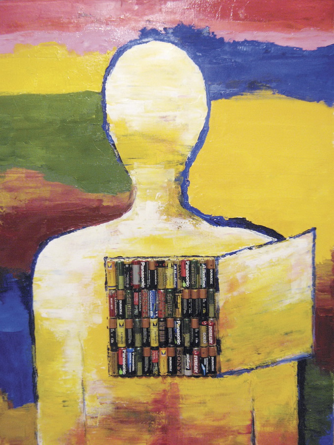 Досить неординарний колаж «Альтернативна енергія»: яскравими фарбами зображений силует людини, замість нутрощів у якої прямокутник зі справжнісінькими батарейками.