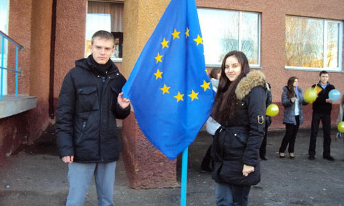 Прапор ЄС, піднятий євроклубівцями Андрієм Савчуком і Настею Воронко, замайорів поряд з прапором України. В руках учні тримали жовто-блакитні кульки і прапорці країн ЄС. А рівно о 10 годині ранку всі чітко вишикувались і "написали" великими літерами "ЄС", захоплено розмахуючи прапорцями.