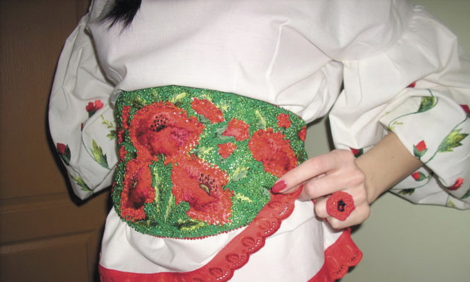 — Я це все пам’ятаю та зараз пристосовую до модних тенденцій і долучаю до своїх суконь, — хвалиться майстриня, демонструючи свій новий виріб — вишиту сорочку з оригінальним поясом й аксесуари до неї — кліпси та перстень. — Бісер, що на поясі, фурнітуру — все замовляла з Києва. Той бісер, який продають у нас, — неякісний. Він ріже нитку, тож у такому разі нема сенсу вкладати у річ стільки душі й роботи. Погляньте, як пояс виблискує і здається, що маки на ньому об’ємні.