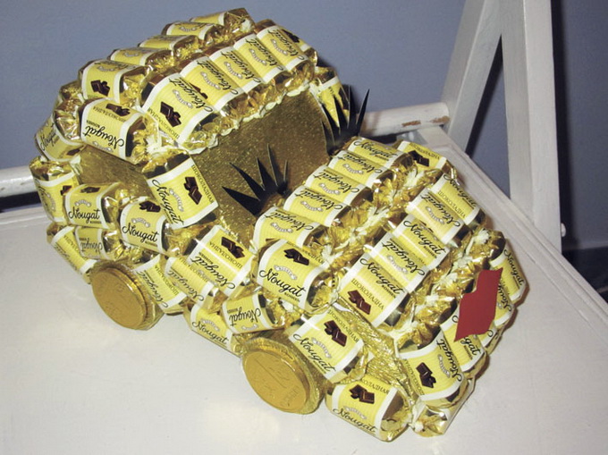 — Якщо кошик із тюльпанами, — пояснює, — то головне зробити ці тюльпани, адже кожен треба вирізати, склеїти, прикрутити на цукерку, а потім на паличку. Машинка трохи більше займає часу. Самими цукерками обкладати її неважко, а от доки каркас зробиш, то треба трохи посидіти, щоб правильно вирізати, щоб усі деталі були рівні. Бо ж не принесеш клієнтові криву машинку. Тому перед святами, скажімо, 8 Березня, раджу робити замовлення за три тижні-місяць.