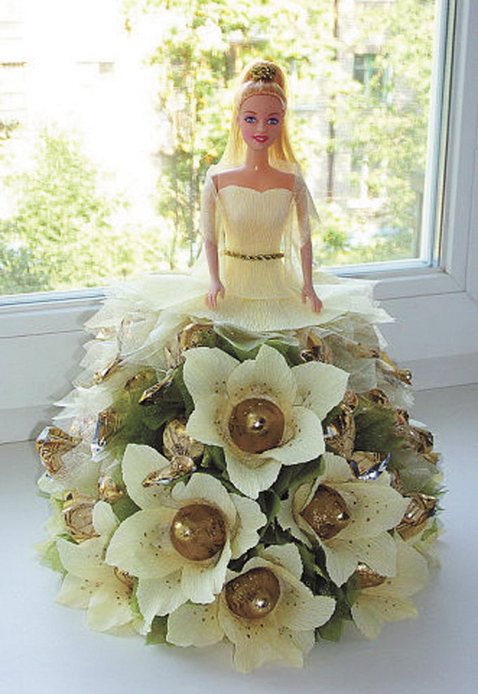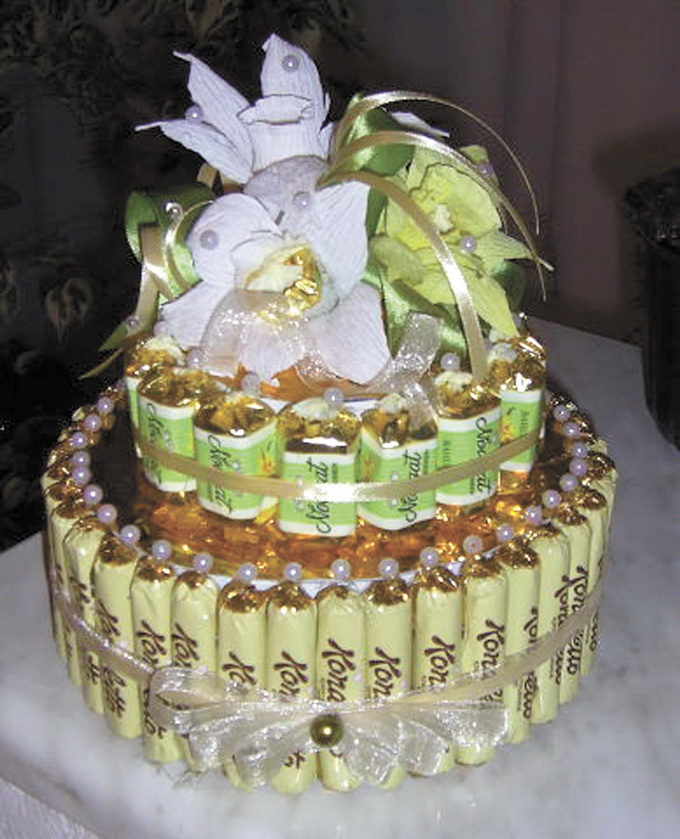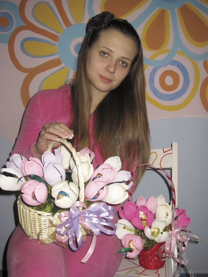 — Можна з’їсти, а потім інші понастромлювати туди, — пояснює Настя. — От із моїх тюльпанів, що у кошиках, цукерки легко виймаються, а з інших, закручених троянд, — трохи важче, бо там приклеюю. Але я не їла б, мені було б шкода. Добре, що я цього не бачу (сміється — авт.). От тюльпанчиків іще не так шкода, а тортики, які я роблю… Вони ж по колу в цукерках, тож мені краще цього не бачити! Знайома замовляла солодку машинку для свого дворічного синочка. Каже, добре, що встигла сфотографувати її, бо за дві хвилини від солодощів лишилися тільки обгортки. А загалом, коли дітлахам дарують такі композиції, їм дуже цікаво. От, наприклад, якщо для дівчинки, то можна ляльку якусь зробити у яскравій сукенці. Й іграшка, і солодощі — два в одному.