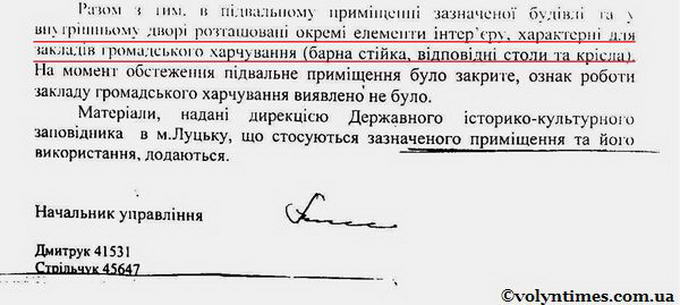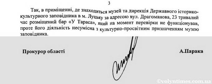 Лише після особистого втручання прокурора Волинської області Андрія Параки прокуратура міста Луцька нарешті визнала факт існування незаконного бару, що більше десяти років діяв у приміщенні дирекції Державного історико-культурного заповідника в м. Луцьку.