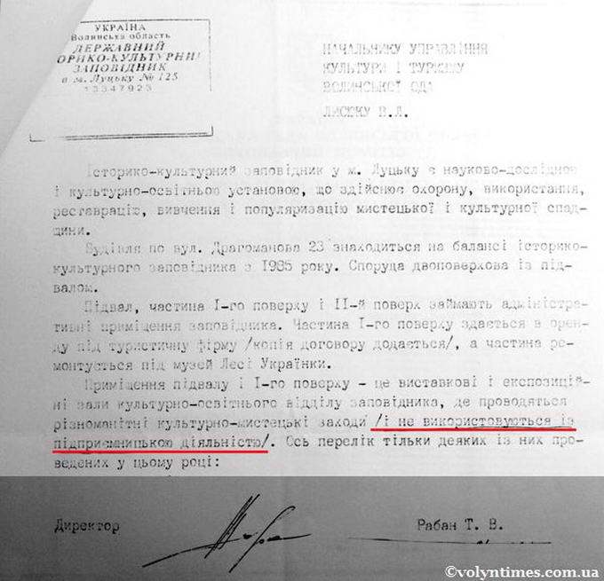 У прокурорській відповіді на запит ГО «Громадська рада Волині», розміщеній на сайті «Волинь Таймс», зокрема, йдеться: «В приміщенні, де знаходиться музей та дирекція Державного історико-культурного заповідника в м. Луцьку за адресою Драгоманова, 23 тривалий час був розміщений бар «У Тараса», який на момент перевірки не функціонував, проте його діяльність несумісна з культурно-просвітним призначенням музею заповідника».