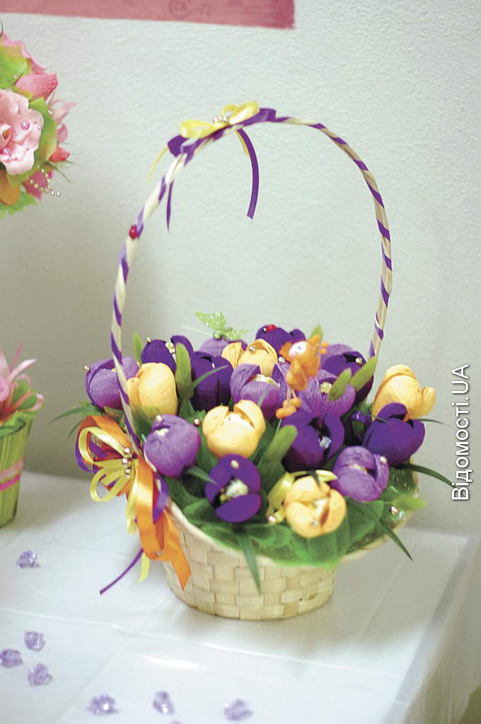 Спершу, зі слів Катерини, вона майструвала переважно солодкі букети. З гофрованого паперу виготовляла квіти, всередину яких ховала сюрприз — смачну цукерку. Та нині майстриня настільки урізноманітнила асортимент своїх композицій, що, здається, зі звичайних цукерок ця дівчинка може створити що завгодно.