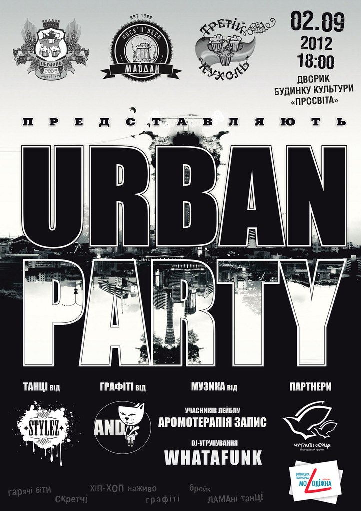 Дійство відбудеться 2 вересня о 18.00 у дворику будинку культури Луцька «Просвіта». На вас чекають танці, графіті, виступ гурту «Аромотерапія», та діджей-угрупування «Whatafunk».